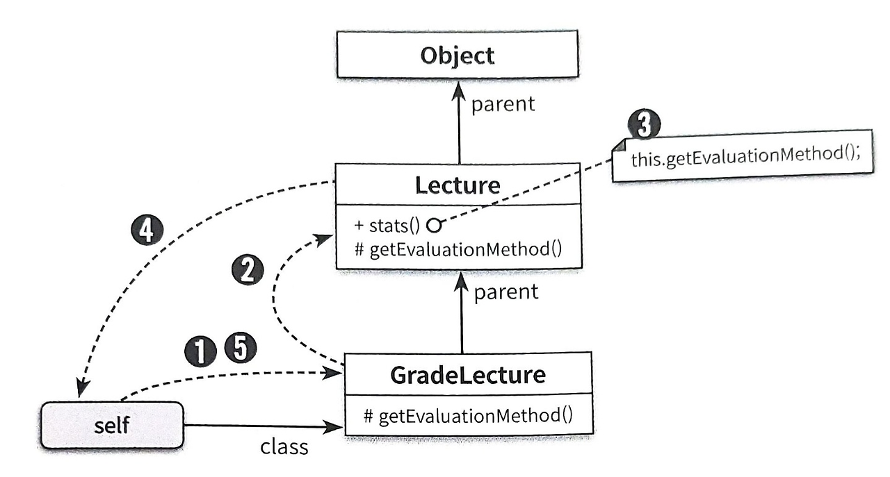 2. 메서드를 탐색하기 위해 동적인 문맥을 사용한다는 것이다. 메시지를 수신했을 때 실제로 어떤 메서드를 실행할지를 결정하는 것은 컴파일 시점이 아닌 실행 시점에 이뤄지며 메서드를 탐색하는 경로는 self 참조를 이용해서 결정한다.